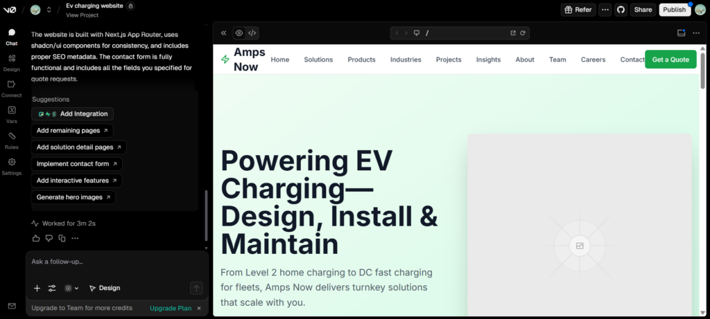 v0.dev generates a complete landing page UI (usually in React + Tailwind style), and I can iterate quickly by asking for changes like: